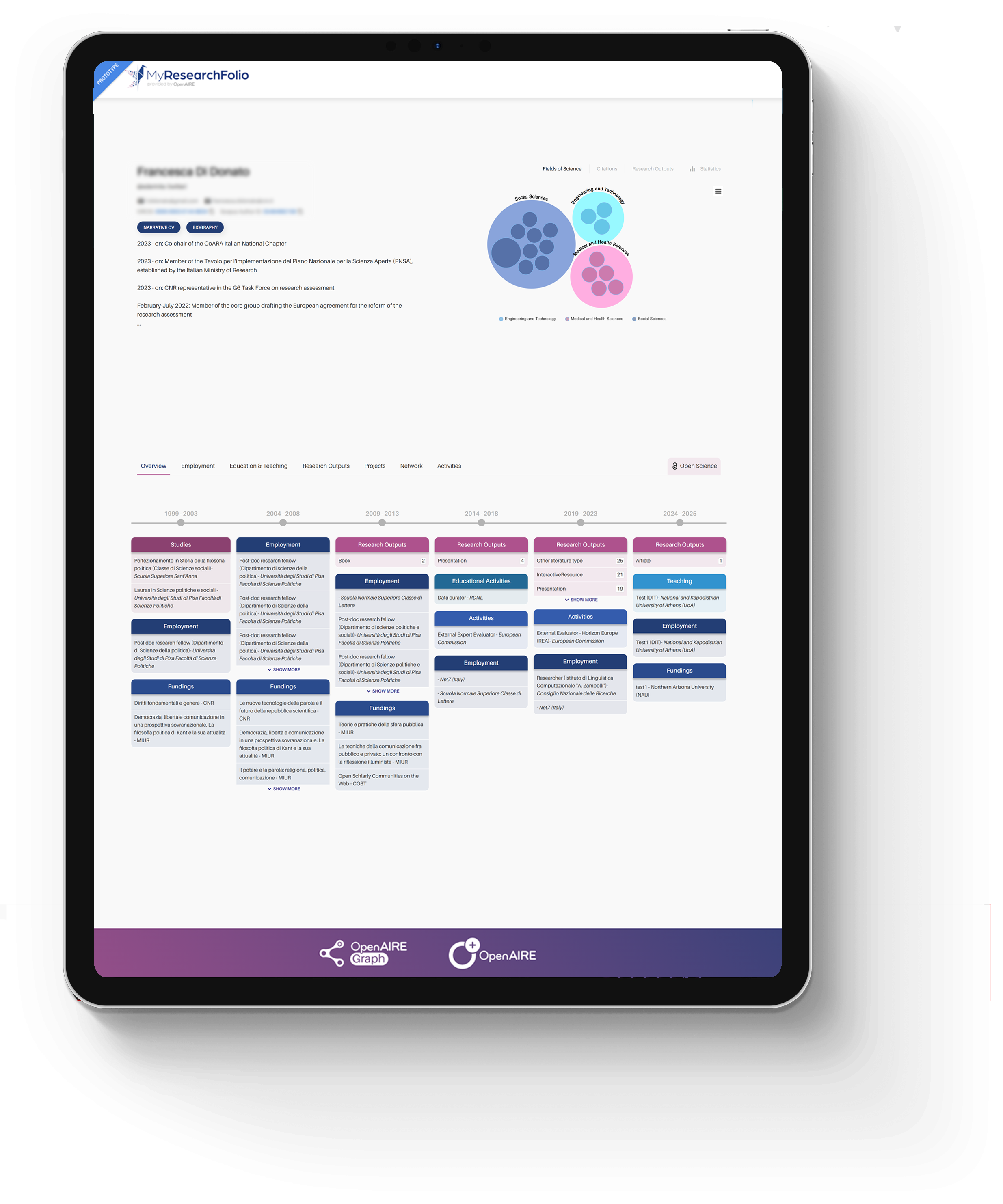 It includes a flexible narrative CV, allowing researchers to present their work in a rich, qualitative way. Highlight leadership, collaboration, impact, and openness—bringing context and meaning to your contributions beyond traditional metrics.